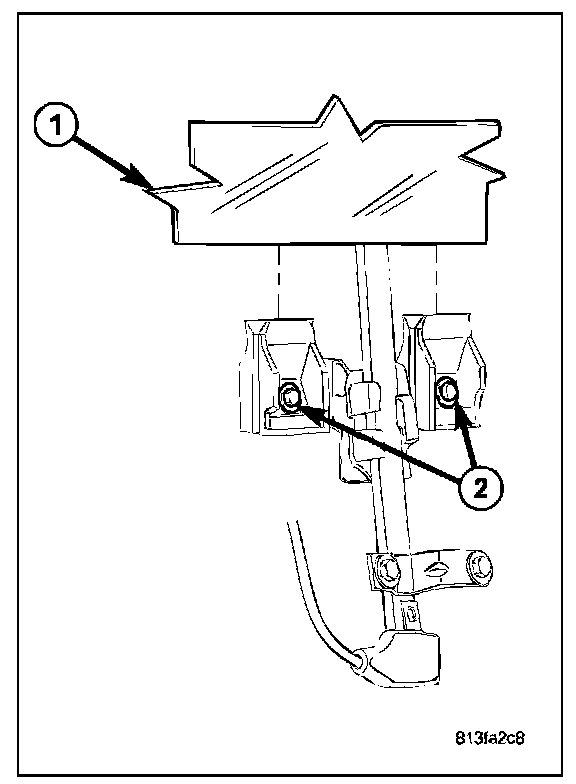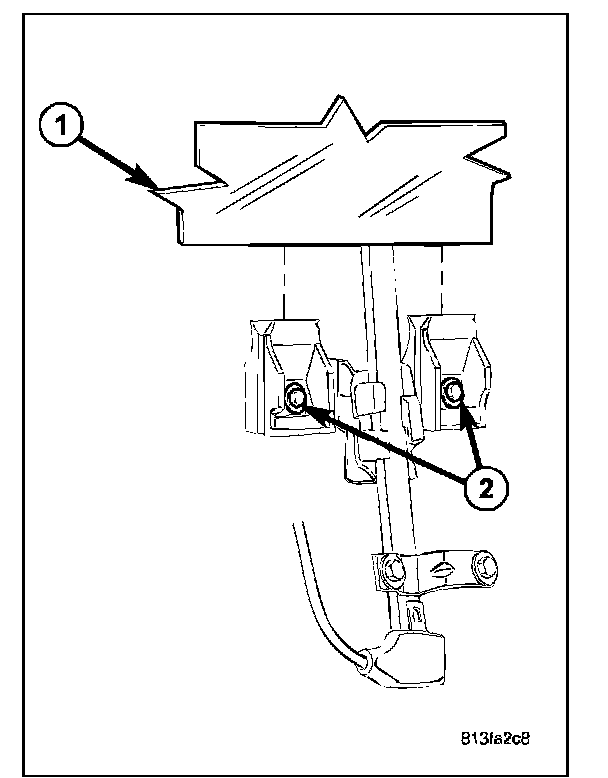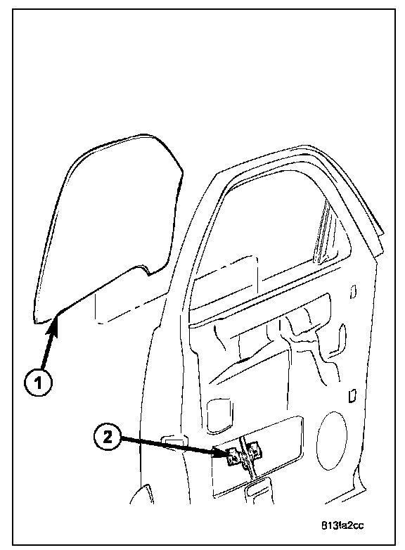 2. Temporarily install the window switch or window handle and position the glass (1) to gain access to the glass clamp screws (2).