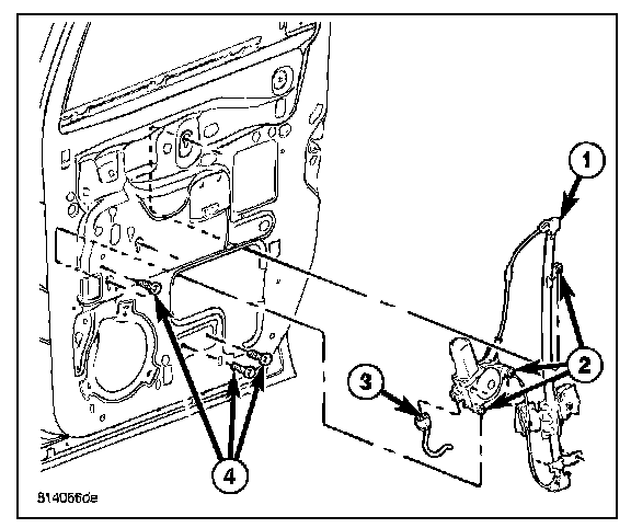 6. Remove the two lower regulator bolts and the one bolt at the motor (4).
