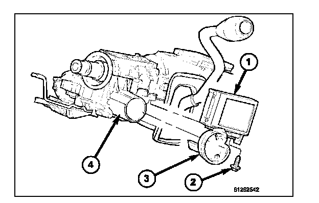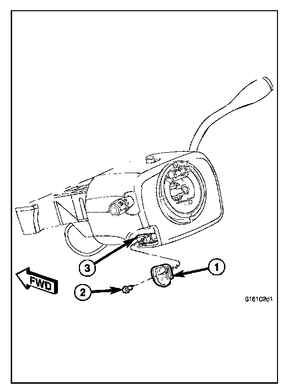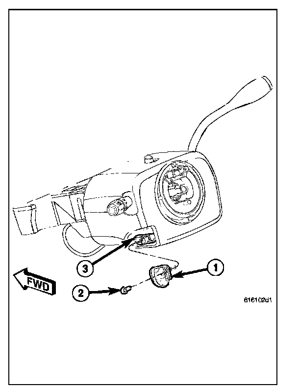 2. Remove the screw (2) that secures the tilt steering column knob (1) and remove it from the tilt actuator (3) on the left side of the column.