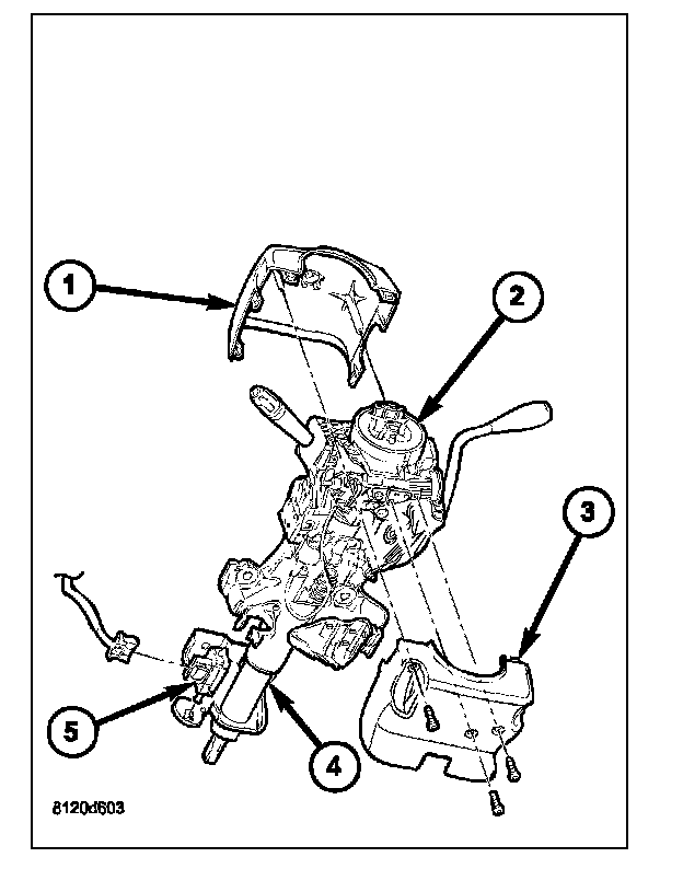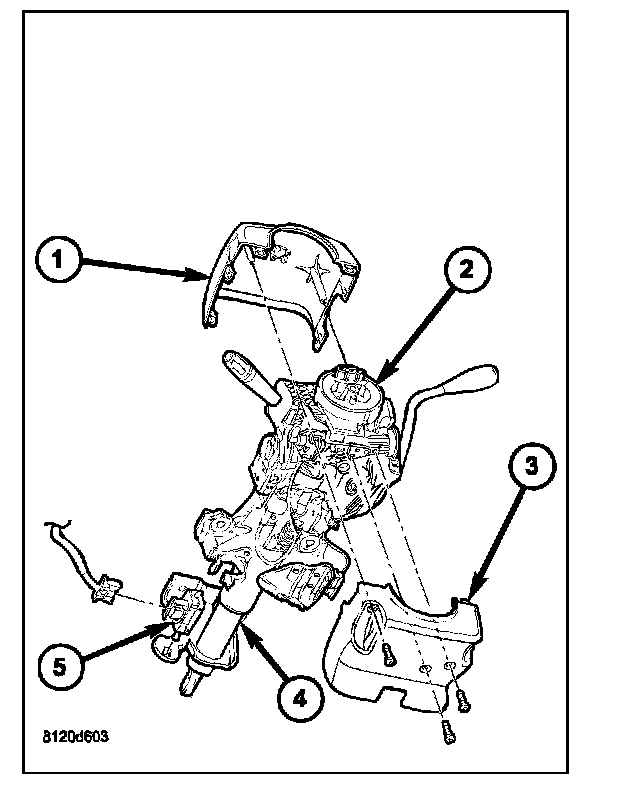 3. From below the steering column, remove the two outboard screws that secure the upper column shroud (1) to the lower shroud (3).