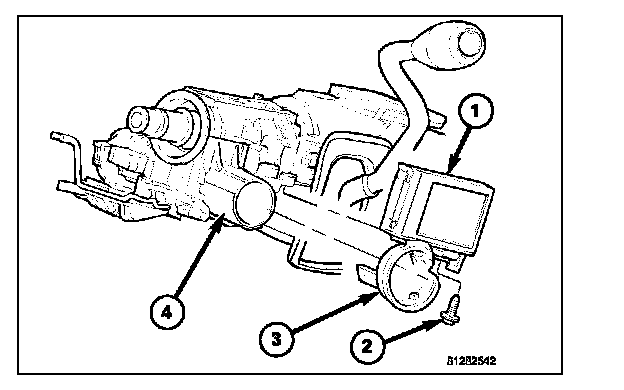 1. Position the Sentry Key REmote Entry Module (SKREEM) (1) onto the steering column with the antenna ring (3) oriented around the ignition lock cylinder housing (4).