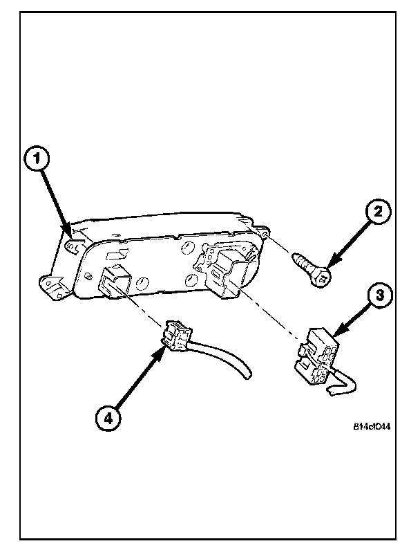2. Remove the center bezel from the instrument panel and disconnect the wire harness connectors (3 and 4) from the A/C-heater control (1).