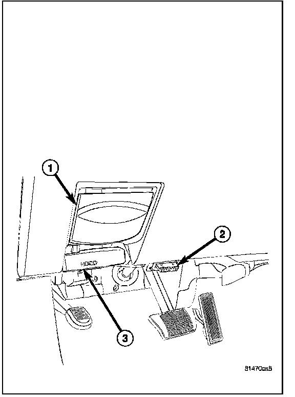 The Data Link Connector (DLC) (2) is a 16-way molded plastic connector insulator on a dedicated take out of the instrument panel wire harness. This connector is located at the lower edge of the instrument panel, outboard of the steering column. The connector insulator is retained by integral snap features within a rectangular cutout in the stamped metal lower instrument panel reinforcement, just below the lower edge of the instrument panel steering column opening cover and inboard of the park brake release (1) and inside hood release (3) handles.