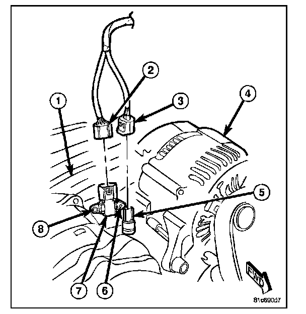MAP SENSOR - REMOVAL - 3.7LThe Manifold Absolute Pressure (MAP) sensor (7) is mounted into the front of the intake manifold (1).