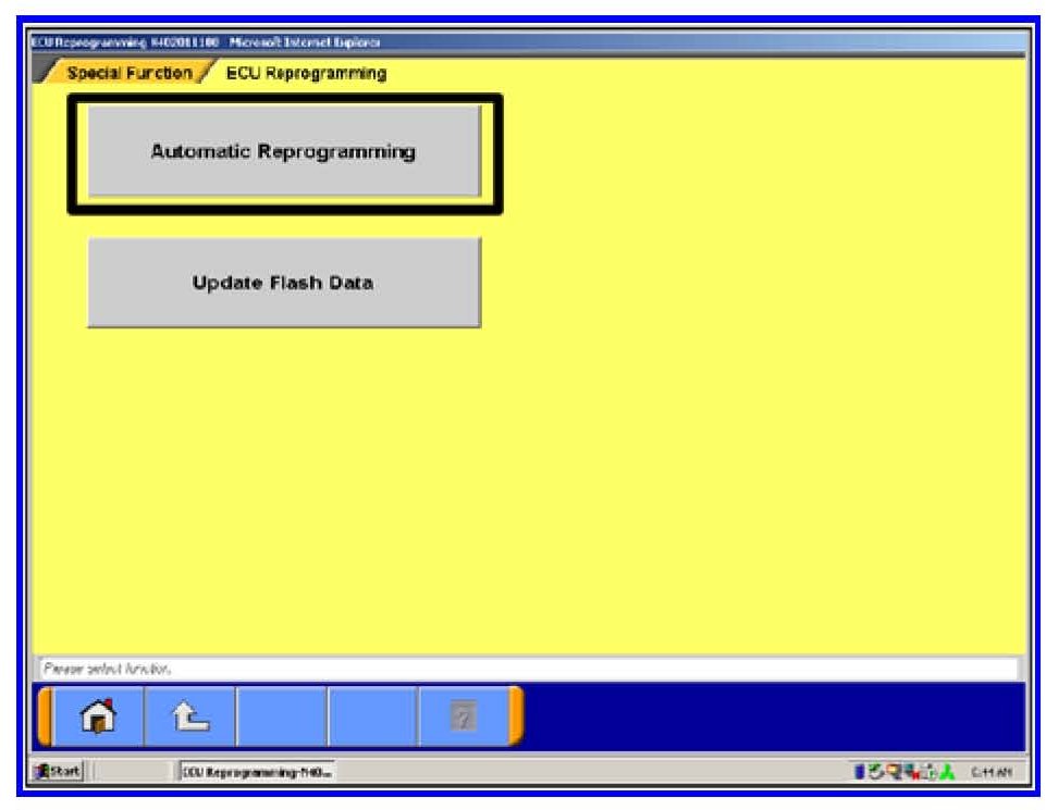 BATTERY VOLTAGE MUST BE MAINTAINED BETWEEN 13.2 AND 13.5 VOLTS. CHECK THE CONDITION OF THE BATTERY AND CHARGE IT IF NECESSARY. CONNECT A BATTERY CHARGER SET TO CONTINUOUS CHARGE TO THE BATTERY. DO NOT ALLOW THE CHARGER TO 'TIME OUT' DURING THE REPROGRAMMING PROCESS. DO NOT ALLOW THE CHARGING VOLTAGE TO EXCEED 13.5 VOLTS DURING THE PROCESS.