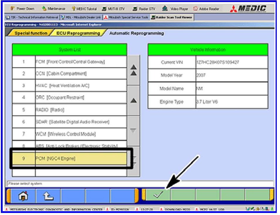 3. Refer to the Raider PCM (ECU) Software Part Number Chart shown in this bulletin or the "Raider ECU Part Number & ECU Calibration" chart on the Mitsubishi Dealer Link in the Service Tech Resources page to identify the appropriate calibration for this programming.