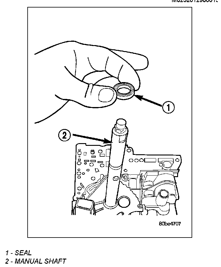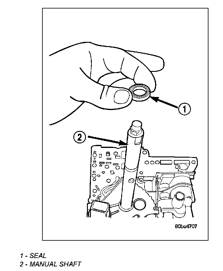 1. Install the TRS (2) to the manual shaft. Make sure TRS locating pin rests in manual valve bore slot.
