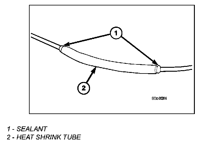 6. Center the heat shrink tubing (2) over the joint and heat using a heat gun. Heat the joint until the tubing is tightly sealed and sealant (1) comes out of both ends of the tubing.