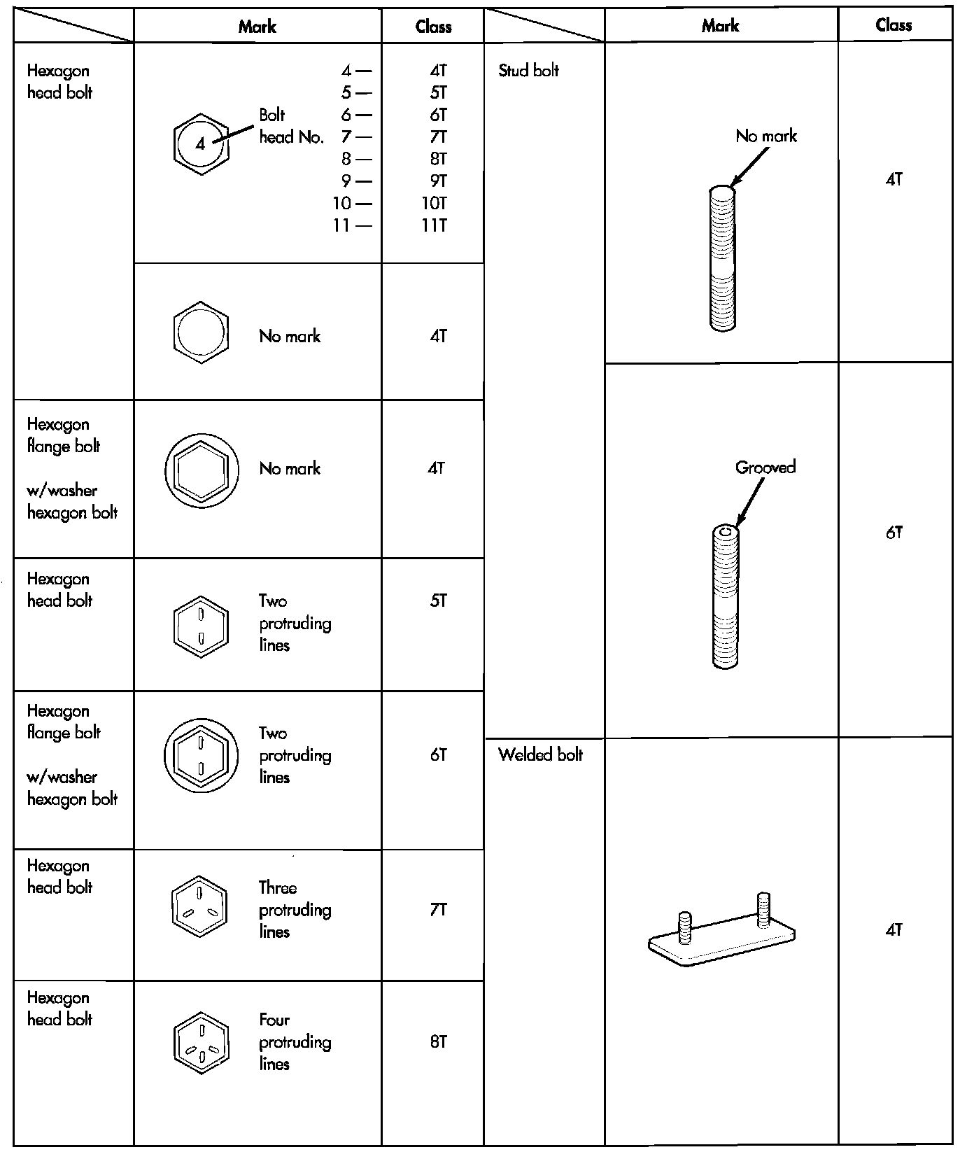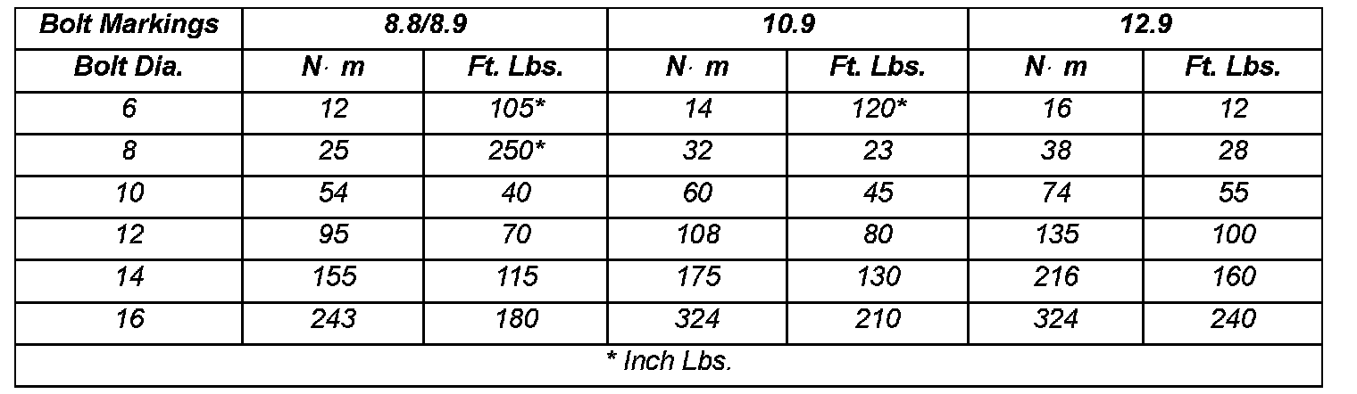 FASTENER IDENTIFICATIONThe SAE bolt strength grades range from grade 2 to grade 8. The higher the grade number, the greater the bolt strength. Identification is determined by the line marks on the top of each bolt head. The actual bolt strength grade corresponds to the number of line marks plus 2. The most commonly used metric bolt strength classes are 9.8 and 10.9. The metric strength class identification number is imprinted on the head of the bolt. The higher the class number, the greater the bolt strength. Some metric nuts are imprinted with a single-digit strength class on the nut face. Refer to the Fastener Identification and Fastener Strength Charts.