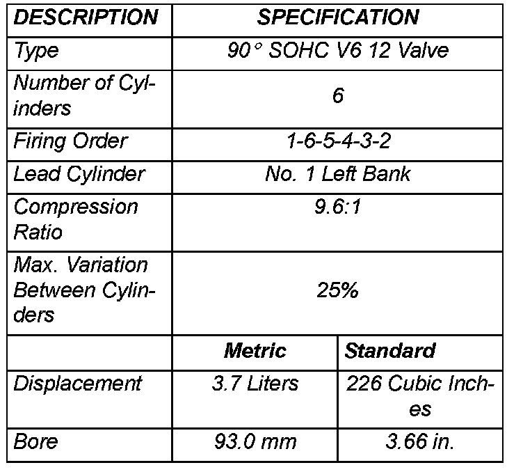 The 3.7 liter (226 CID) six-cylinder engine is an 90° single overhead camshaft engine. The cast iron cylinder block is made up of two different components; the first component is the cylinder bore and upper block, the second component is the bedplate that comprises the lower portion of the cylinder block and houses the lower half of the crankshaft main bearings. The cylinders are numbered from front to rear with the left bank being numbered 1, 3, and 5 and the right bank being numbered 2, 4, and 6. The firing order is 1-6-5-4-3-2. The engine serial number is located at the right front side of the engine block.