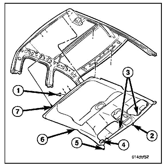 6. Install the headliner (6). (Refer to - INTERIOR/HEADLINER/INSTALLATION)