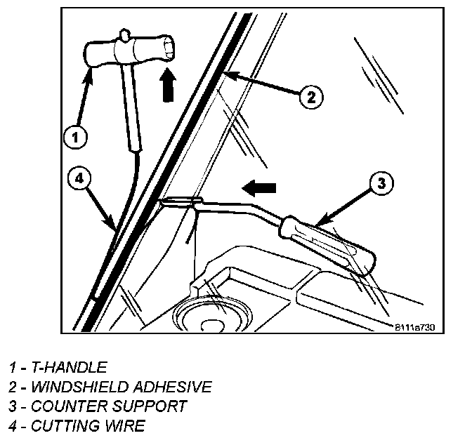 7. Using a windshield cut-out wire (4) or equivalent, separate the adhesive (2).