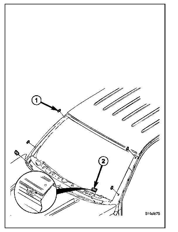 2. Remove the screws (2) attaching the side windshield molding (1) to the a-pillars and remove the molding.