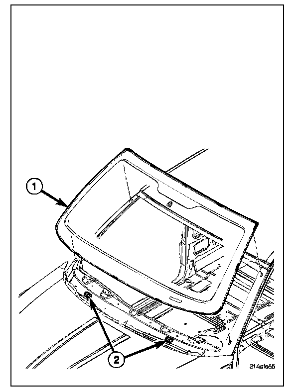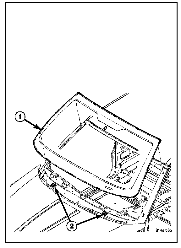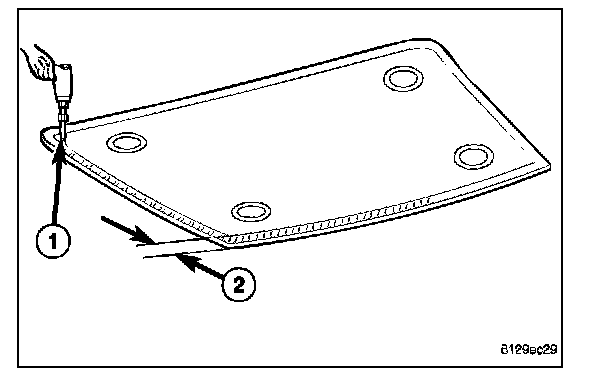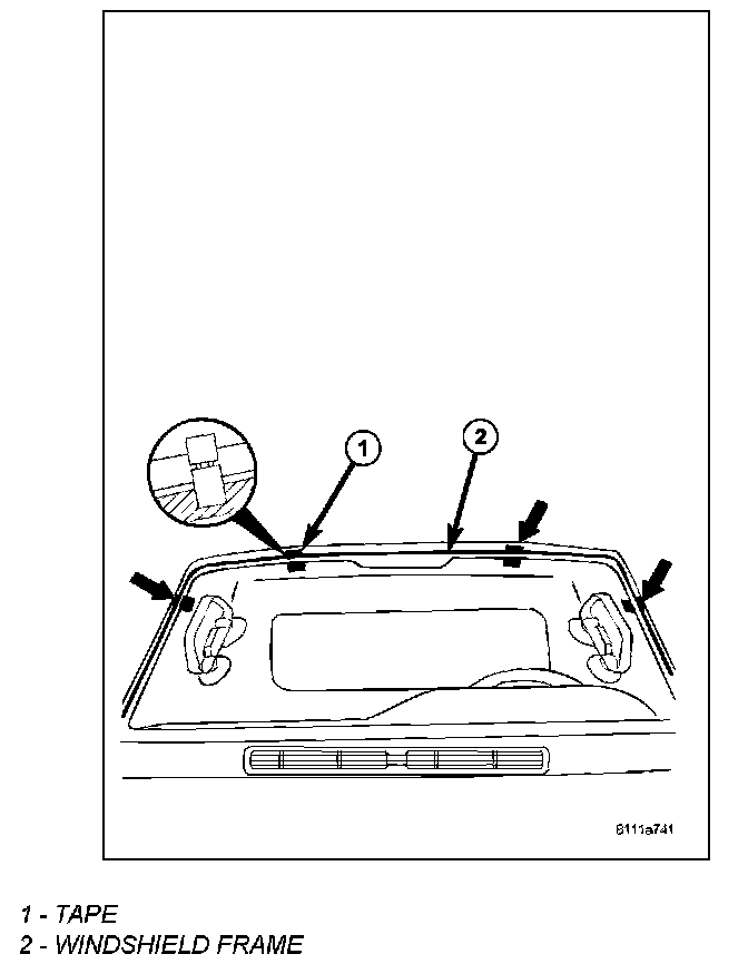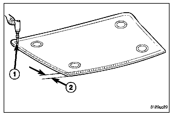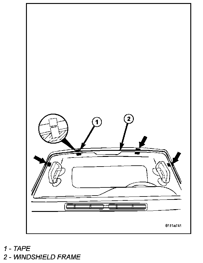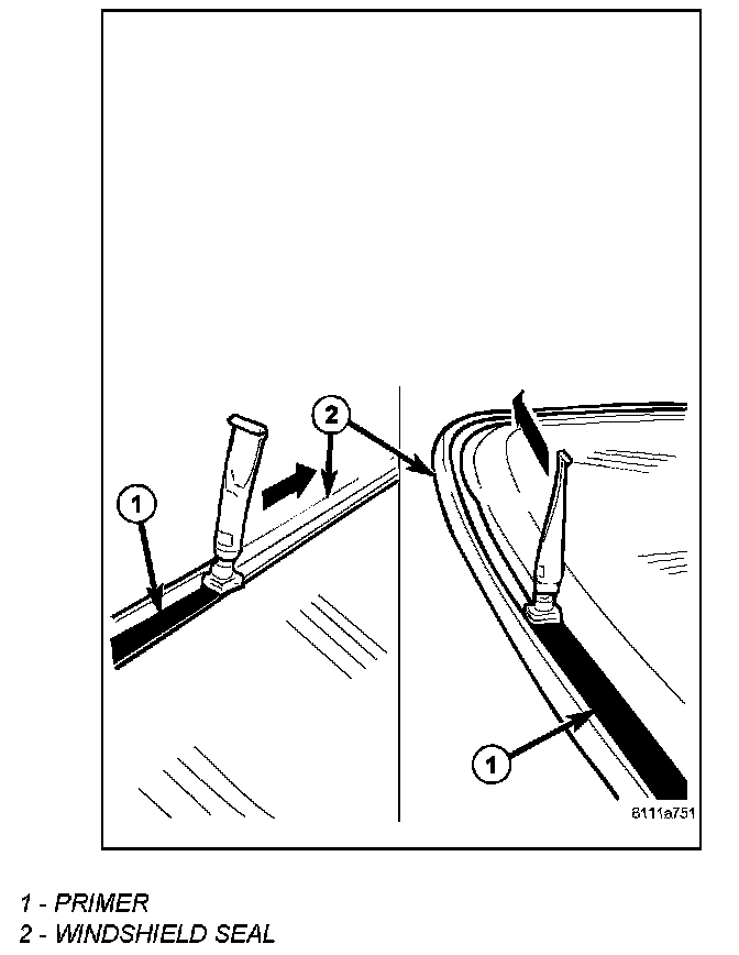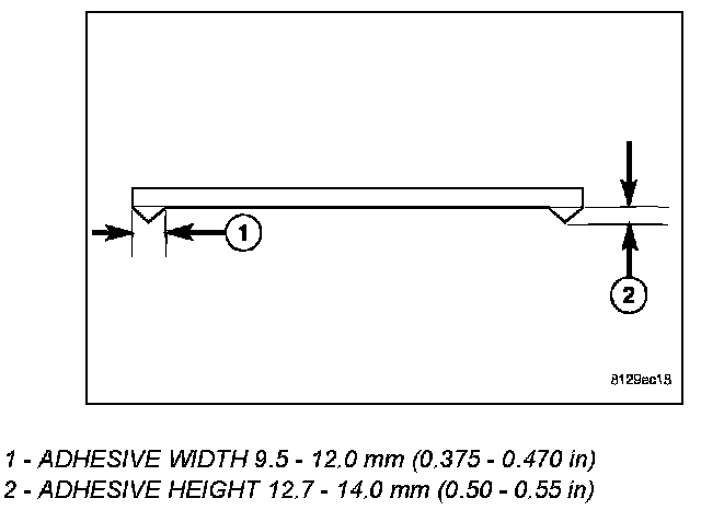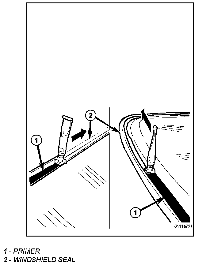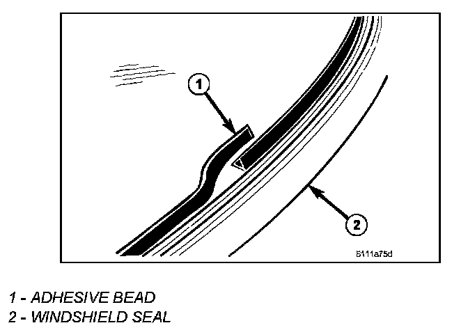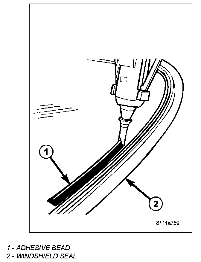 1. Apply bead of adhesive (1) with a triangular nozzle directly to the windshield seal starting at bottom in center of windshield.