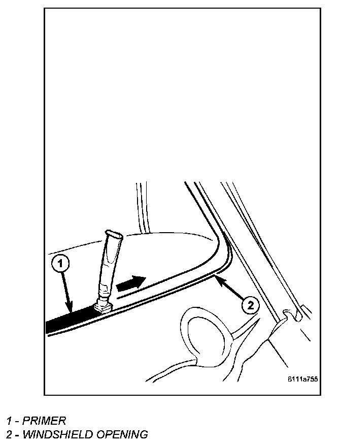 13. Apply primer (1) around the perimeter of the glass to a width of 15 mm (0.5 in.) (2).