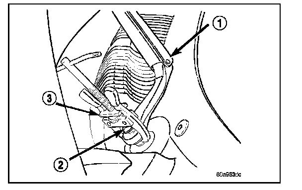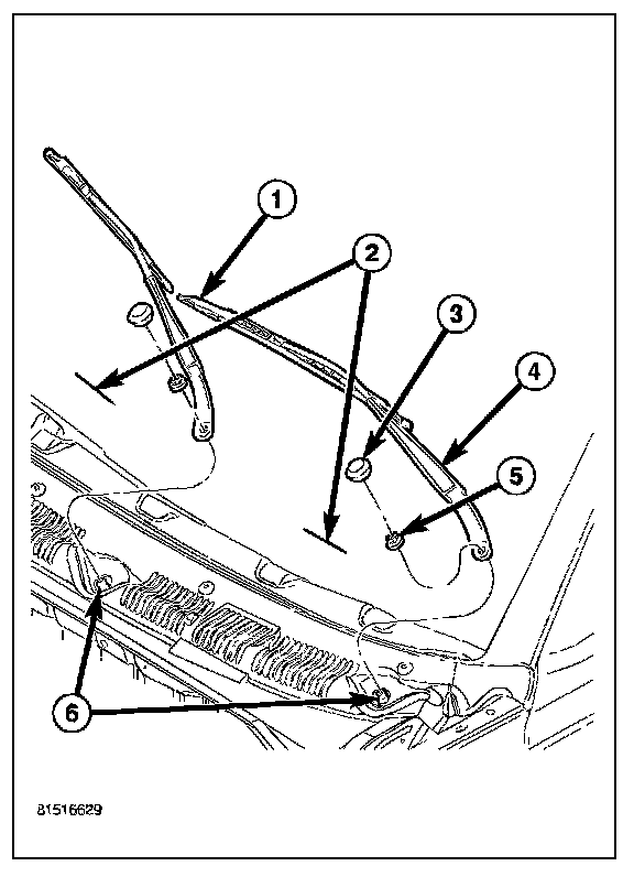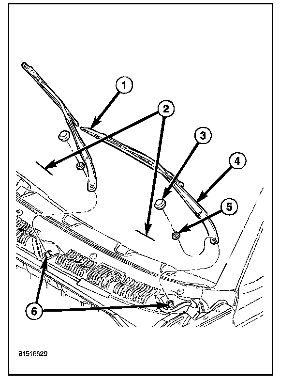 REMOVAL1. Lift the wiper arm (4) to its over-center position to hold the wiper blade (1) off of the glass and relieve the spring tension on the wiper arm to wiper pivot shaft (6) connection.