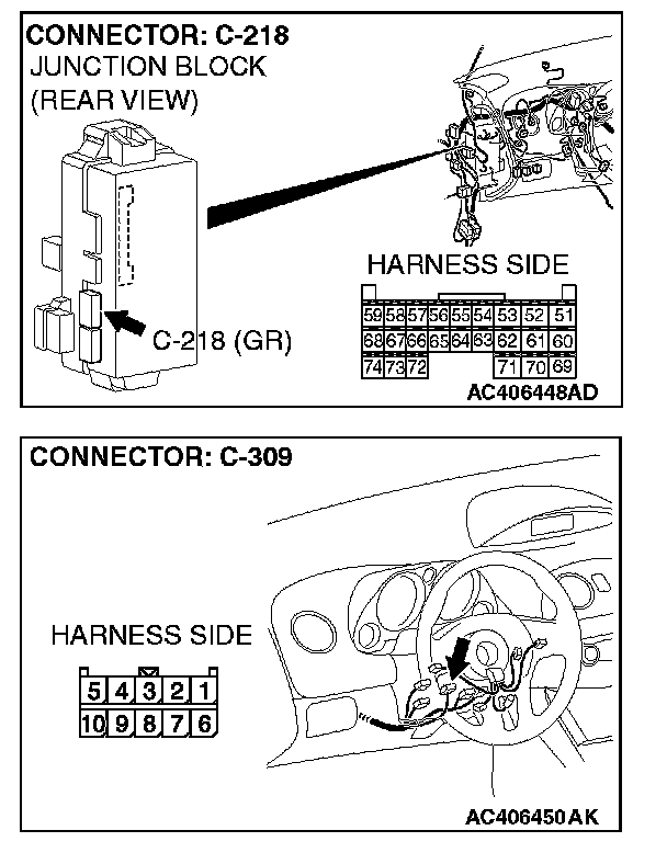 STEP 5. Check the wiring harness between column switch connector C-309 (terminal 6) and ETACS-ECU connector C-218 (terminal 66).