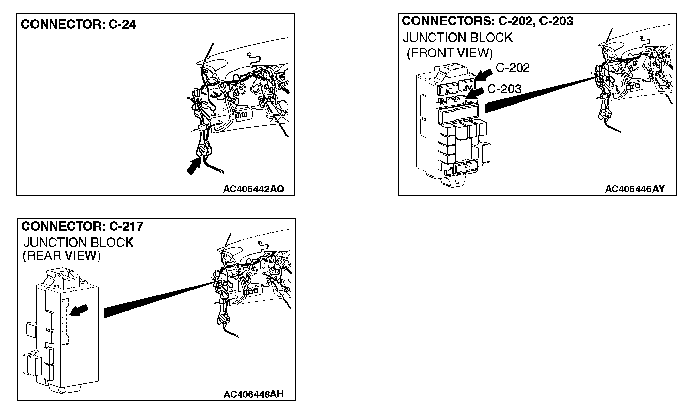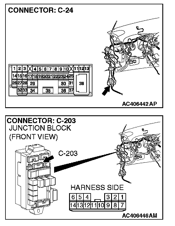 NOTE: Also check junction block connector C-203 and intermediate connector C-24 for loose, corroded, or damaged terminals, or terminals pushed back in the connector. If junction block connector C-203 or intermediate connector C-24 is damaged, repair or replace the damaged component(s) as described.