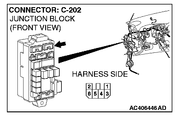 NOTE: Also check junction block connector C-202 for loose, corroded, or damaged terminals, or terminals pushed back in the connector. If junction block connector C-202 is damaged, repair or replace the damaged component(s) as described in