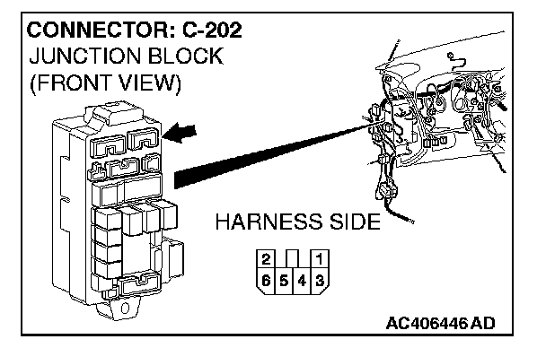 NOTE: Also check junction block connector C-202 for loose, corroded, or damaged terminals, or terminals pushed back in the connector. If junction block connector C-202 is damaged, repair or replace the damaged component(s) as described.