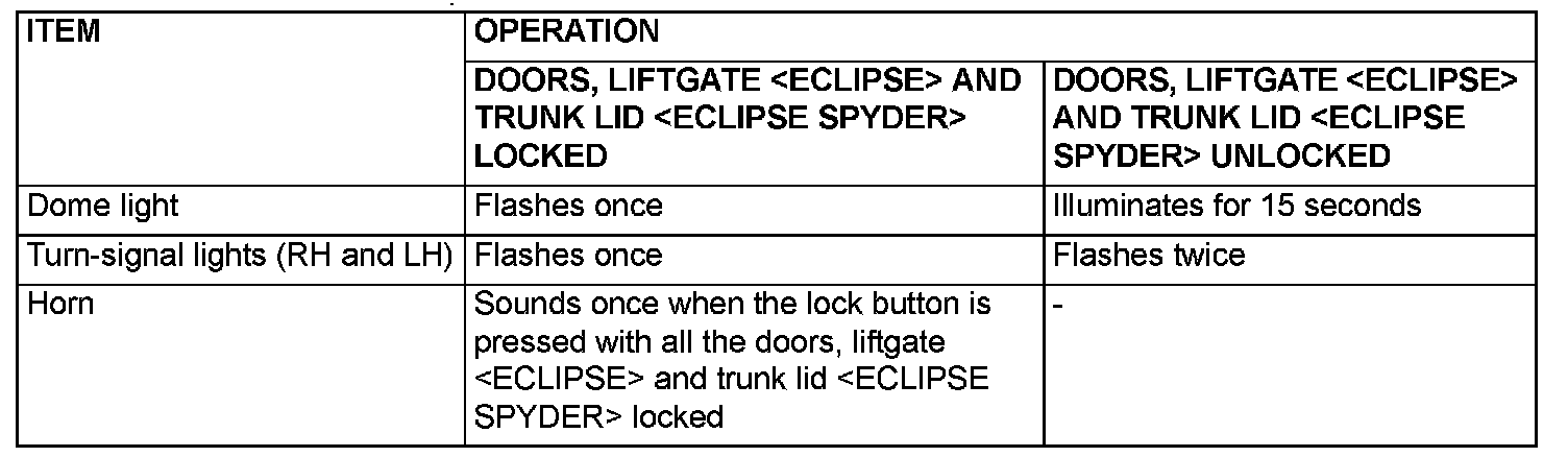 - When the transmitter unlock button is pressed once, the driver's door will be unlocked. If the button is pressed twice, all the doors, liftgate [ECLIPSE] and trunk lid [ECLIPSE SPYDER] will be unlocked.