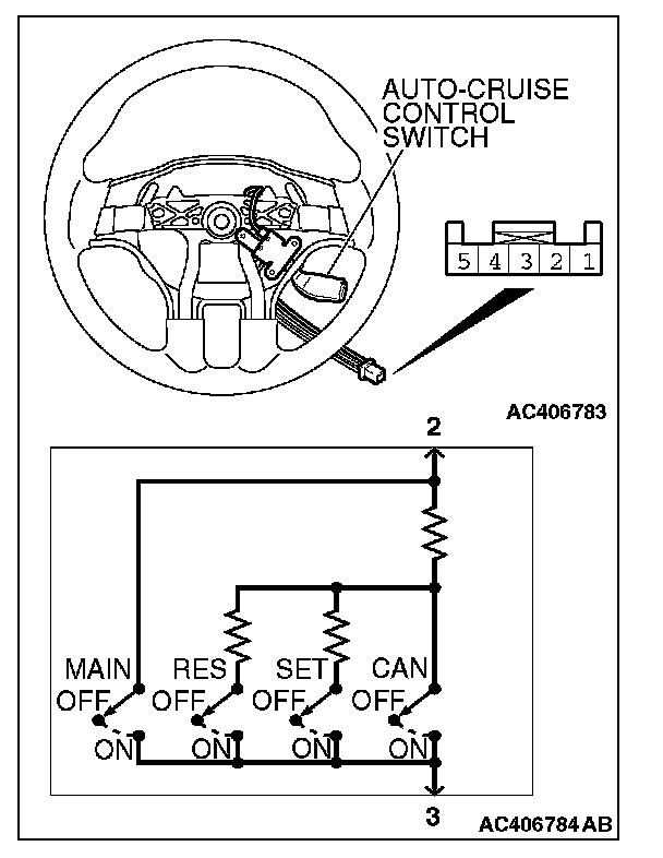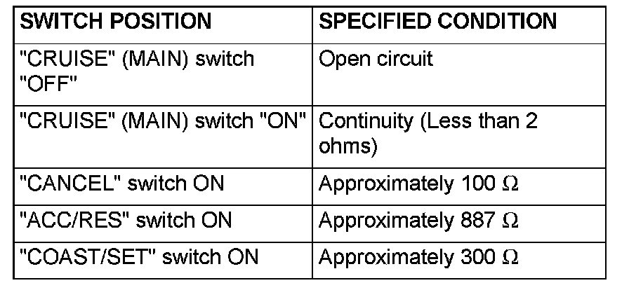 2. Measure the resistance between terminal 2 and terminal 3 when each of the "COAST/SET", "ACC/RES", "CANCEL" and "CRUISE" (MAIN) switches is pressed. If values measured at the time each switch is pressed correspond to those in the table below, the resistance values are correct.