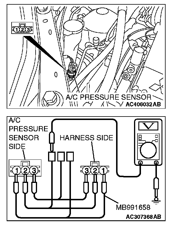 2. Disconnect the A/C pressure sensor connector and connect special tool test harness MB991658 as shown in the illustration.