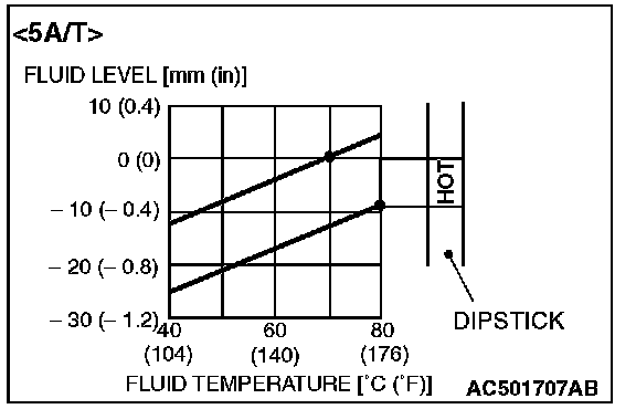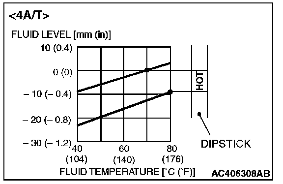 NOTE: If it takes some amount of time until the transmission fluid reaches its normal operating temperature [70 - 80° C (158 - 176° F)], check the transmission fluid level by referring to the left diagram.