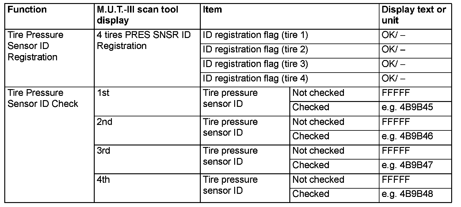 When the TPMS "Special Function" is executed, the TPMS receiver uses the data below.