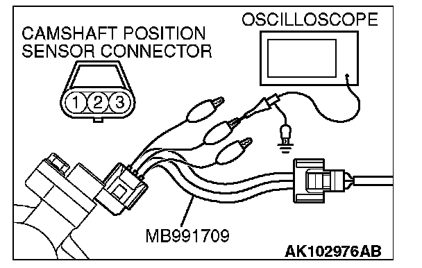 1. Disconnect the camshaft position sensor connector, and connect the test harness special tool (MB991709) between the separated connector (All terminals should be connected).