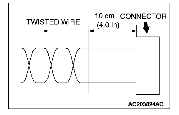 - If the connector or wire on the main bus line or the sub-bus wire is replaced, the strand end of the twisted wire should be within 10 cm (4.0 inches) from the connector. If it exceeds 10 cm (4 inches), twist the wiring harness just like the original twisted wire. If the strand end exceeds 10 cm (4 inches), noise suppression is deteriorated, causing a communication error.
