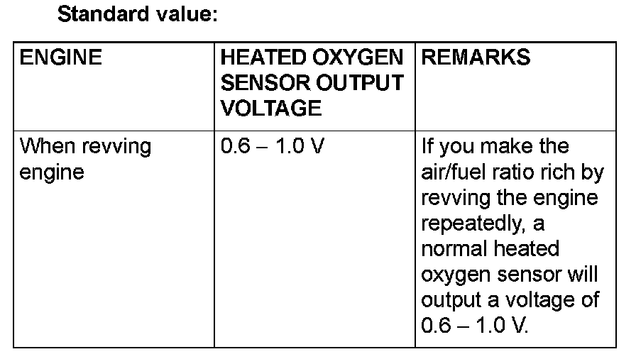 NOTE: If the temperature of sensing area does not reach the high temperature [of approximately 400 °C (752 °F) or more] even though the oxygen sensor is normal, the output voltage would be possibly low in spite of the rich air-fuel ratio.
