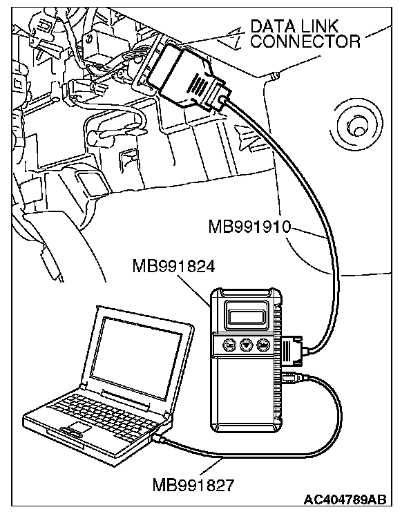 CAUTION: To prevent damage to scan tool MB991958, always turn the ignition switch to the "LOCK" (OFF) position before connecting or disconnecting scan tool MB991958.