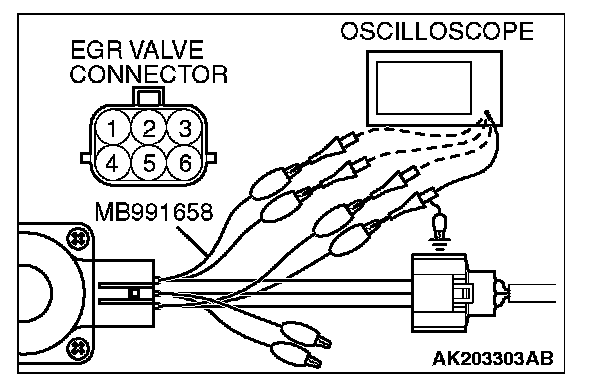 2. Connect the oscilloscope probe to the EGR valve connector terminal No. 1, terminal No. 3, terminal No. 4, terminal No. 6 respectively.
