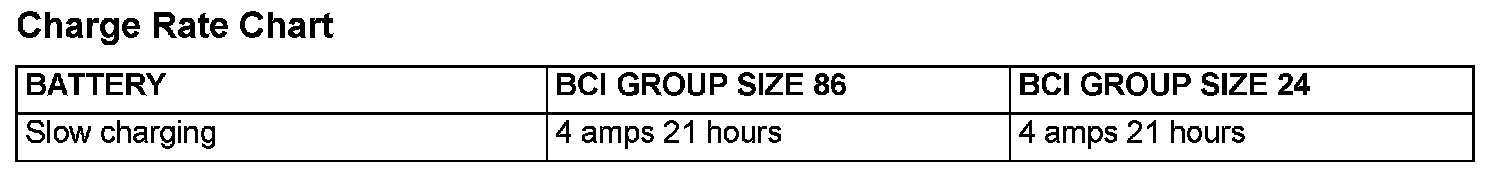 Recommended rate and time for fully discharged condition (flat discharged) is shown below. When the specific gravity of electrolyte keeps 1.22 - 1.29 for more than one hour, charging should be stopped.