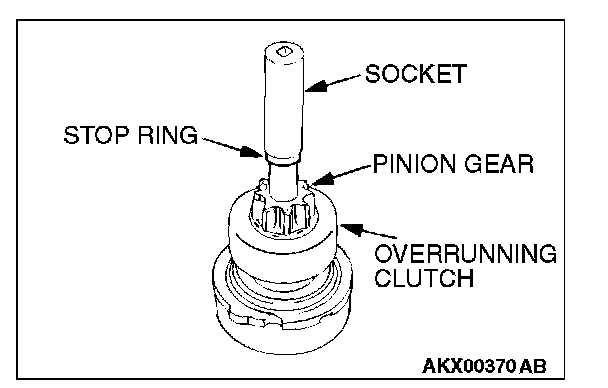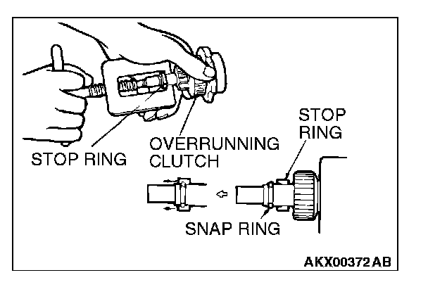 2. After removing the snap ring (by using snap-ring pliers), remove the stop ring and the overrunning clutch.