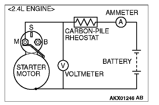 2. Connect a test ammeter (100-ampere scale) and carbon pile rheostat in series between the positive battery terminal and starter motor terminal.