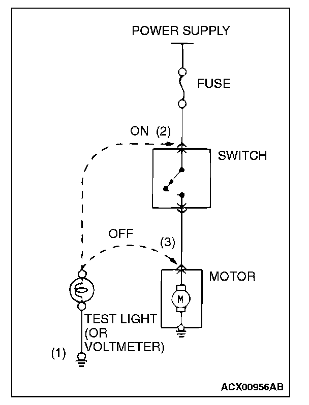 3 Then, connect the test light or voltmeter to the motor connector. The test light should not come on, or the voltmeter should indicate no voltage. When the switch is turned ON in this state, the test light should come on, or the voltmeter should indicate a voltage, with the motor starting to run.