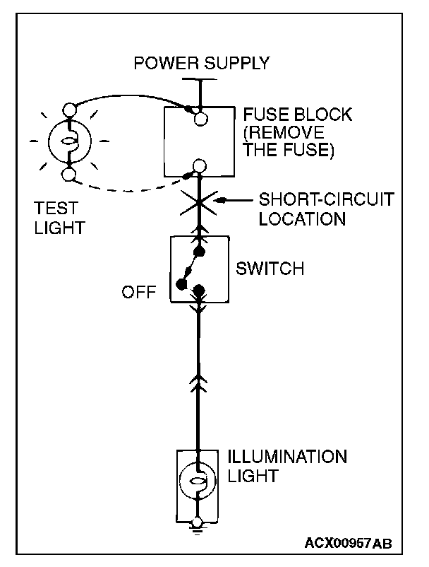 STEP 1. Remove the blown fuse and connect the test light across the fuse terminals (Circuit switch: OFF).
