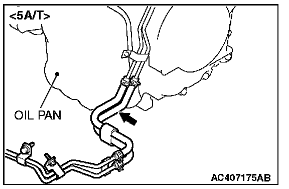 1. Disconnect the hose shown in the illustration which connects the transaxle and the oil cooler (inside the radiator). Place a container under the hose to collect the discharge.
