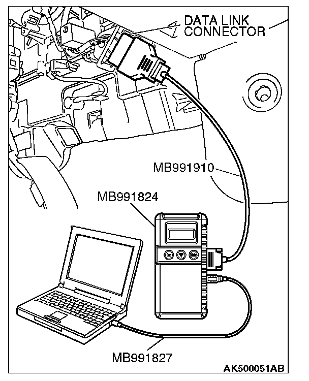 CAUTION: To prevent damage to scan tool MB991958, always turn the ignition switch to the "LOCK" (OFF) position before connecting or disconnecting scan tool MB991958.