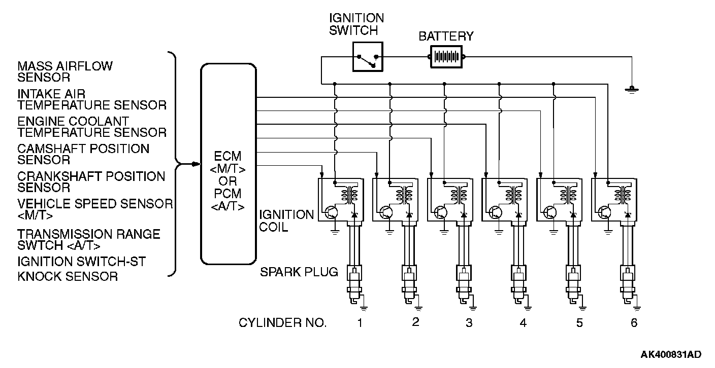 The ECM or PCM determines which ignition coil should be controlled by means of the signals from the camshaft position sensor which is incorporated in the camshaft and from the crankshaft position sensor which is incorporated in the crankshaft.