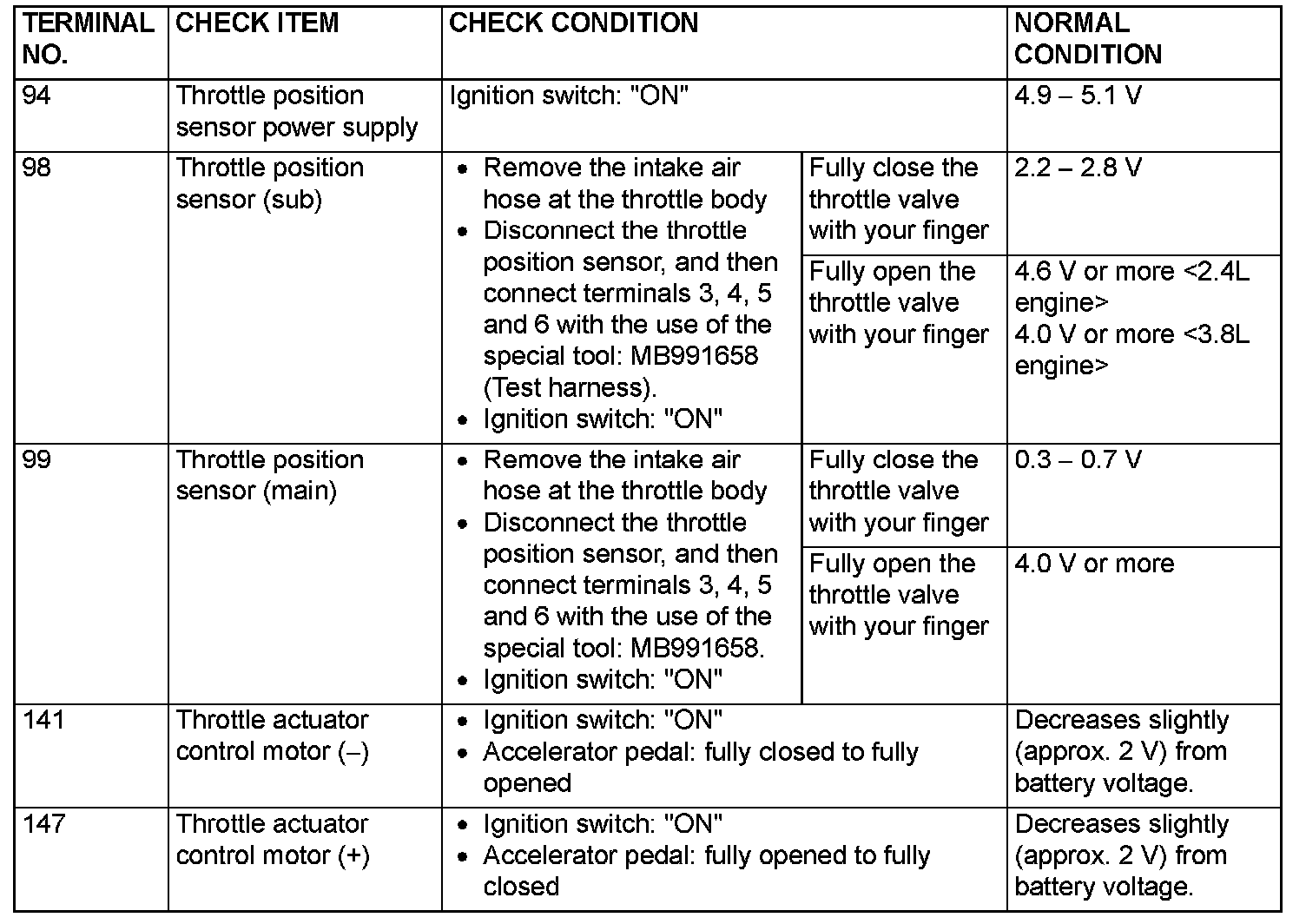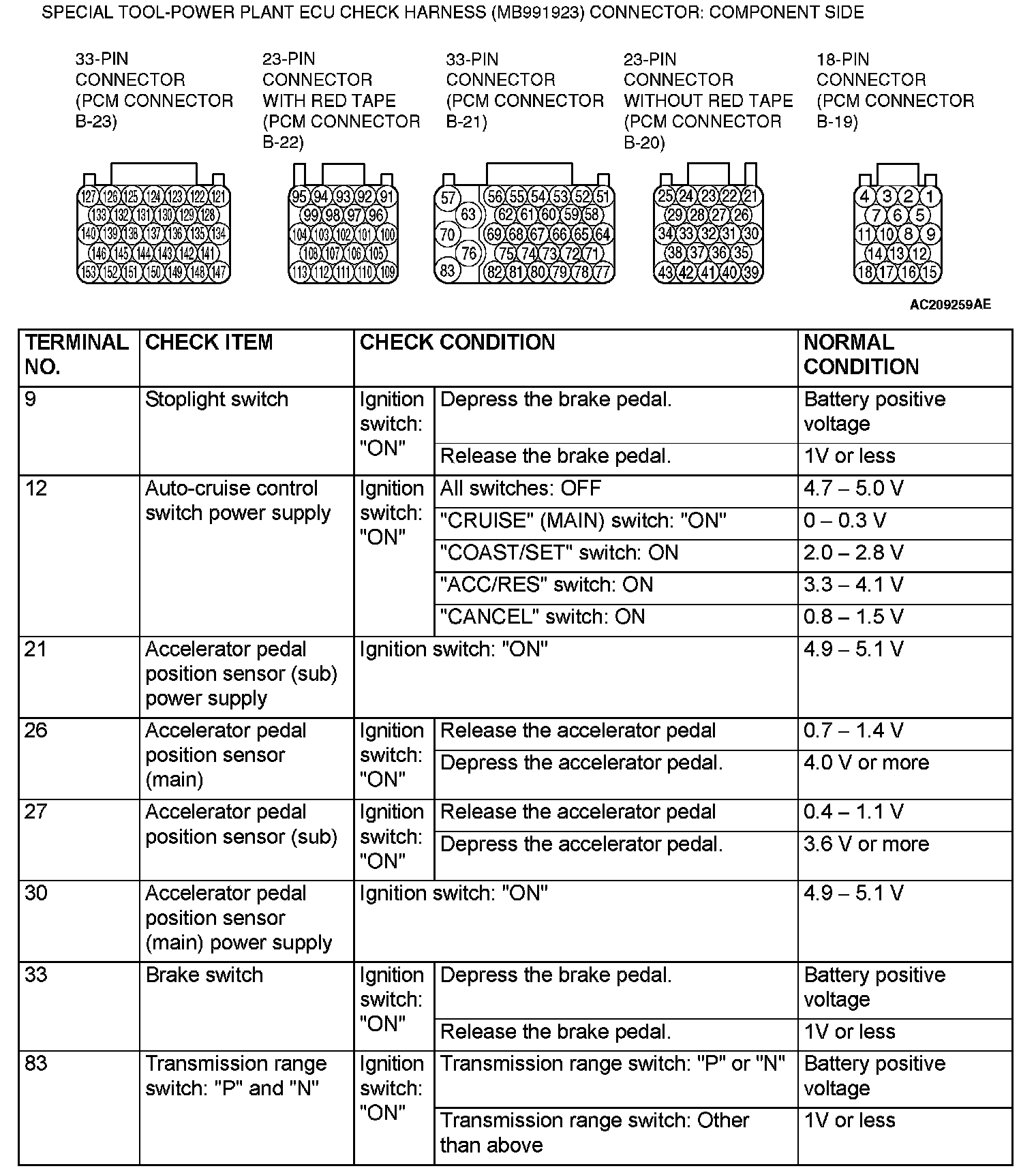 PCM TERMINAL VOLTAGE REFERENCE CHART FOR AUTO-CRUISE CONTROL SYSTEM OPERATION1. Disconnect the PCM connectors, and connect special tool MB991923 (Power plant ECU check harness) in between.