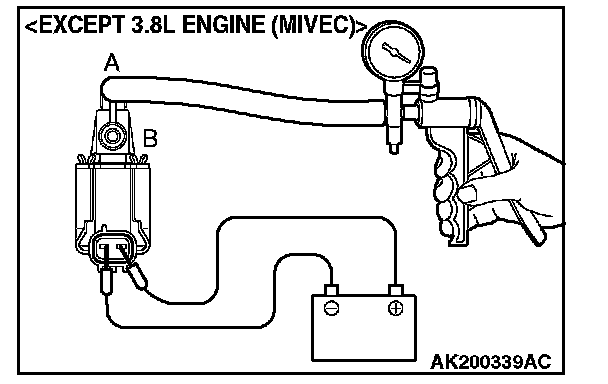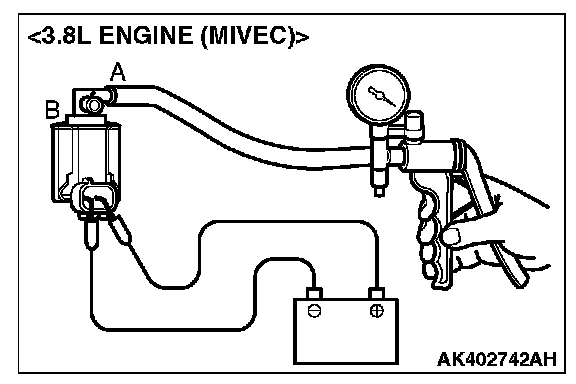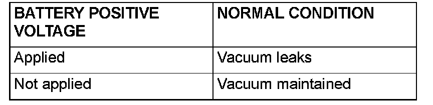 4. As described in the chart below, check airtightness by applying a vacuum with voltage applied directly from the battery to the EVAP purge solenoid valve and without applying voltage.