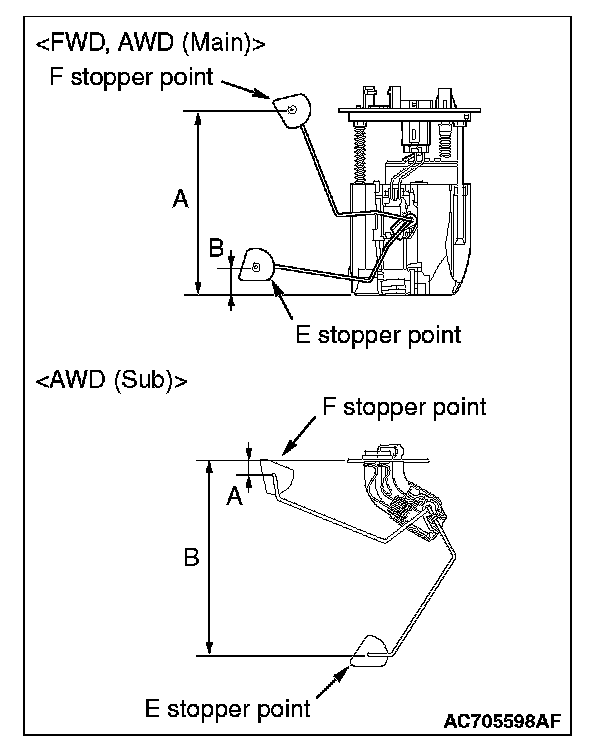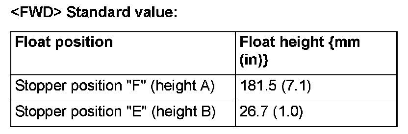When float is moved to contact the float arm on the stopper, ensure that stopper positions "F" (height A) and "E" (height B) are within the standard value.