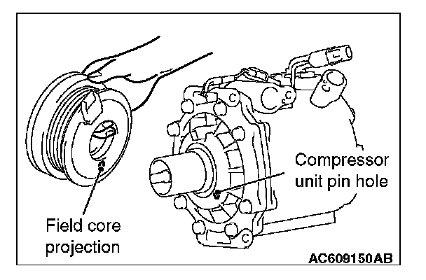 Line up the pin hole on the compressor unit with the field core projection and attach.