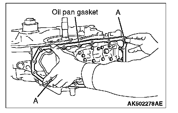 ^ When installing the oil pan gasket, align the dowel pins of transaxle case with dowel pin holes A of the oil pan gasket.