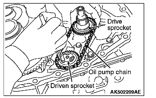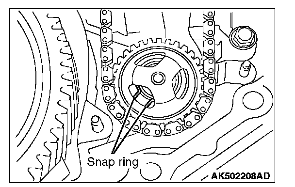 49. Expand the snap ring, and install the driven sprocket, oil pump chain, and drive sprocket.
