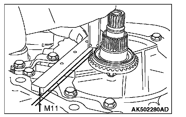 1) Measure the distance M11 between the edge of transaxle case and the adjusting shim mounting surface of drive sprocket.