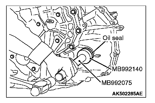 60. Using the special tools MB992140 and MB992075, install the side oil seal on the transaxle case.